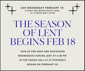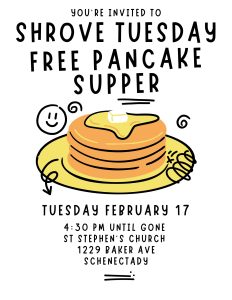 Tuesday, February 17: Mark your calendars for the Annual Pancake Supper: The Shrove Tuesday Pancake Supper will be held on Tuesday, February 17, from 4:30 p.m. until gone, in the Parish Hall. Please spread the word with your friends, neighbors, and family. Meal is free of charge (free will donations accepted).
